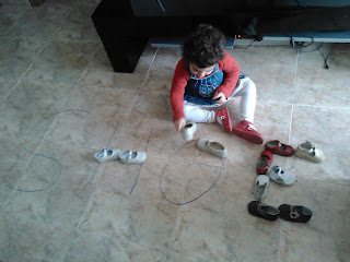 - Shoes: we gathered all Noarai's a Lucia's shoes on the sofa. And we counted them, separate them by color, type. We played a matching pair game. And of course we tried them on. Even Lucia got in the fun. We wrote shoe and we made a graph of the colors. Finally we wrote shoe with shoes on the floor.